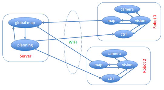 一个使用ROS的系统包括一系列进程,这些进程存在于多个不同的主机并且在运行过程中通过端对端的拓扑结构进行联系。虽然基于中心服务器的那些软件框架也可以实现多进程和多主机的优势,但是在这些框架中,当各电脑通过不同的网络进行连接时,中心数据服务器就会发生问题。